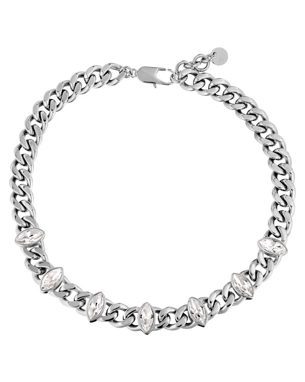 PUNICA is a chunky short necklace that lies beautifully in the neckline with its 42 cm length + 5 cm. extension chain. Super rock`n`roll, attention-grabbing and at the same time wearably modern. The chain jewel is designed in polished steel, and the seven navette-shaped crystals stun and surprise. Wear PUNICA with a simple top or evening dress as you please. Shown here silver tone version with stones in classic cwhite crystal. DANISH DESIGN - free of cadmium, lead and nickel.
