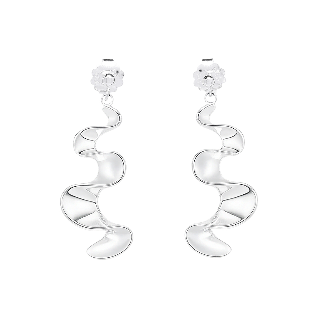 A pair of big, polished silver earrings from Drakenberg Sjölin featuring softly flowing, sculptural shapes. Elegant and timeless dangling silver earrings inspired by Scandinavian design, perfect for both everyday wear and special occasions.